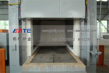 臺車上按裝有耐壓抗高溫的鑄鋼爐底板,以承載工件之用。為了防止工件加熱后產生的氧化皮通過爐底板間的縫隙落入加熱元件周圍而造成加熱元件損壞,因此爐底板與爐體接觸處采用插入式接觸。
