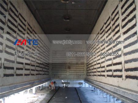 爐襯:該爐爐體部分采用全纖維,纖維根據爐膛尺寸定做成模塊,將纖維壓縮成塊狀進行現場筑棉,固定方式采用穿肖加鉤釘固定,即在塊狀纖維棉中均勻穿肖,然后用鉤釘鉤住穿肖,拉緊后與爐體焊接。在臺車耐壓部分采用高鋁磚砌筑,下部均有保溫磚保溫。